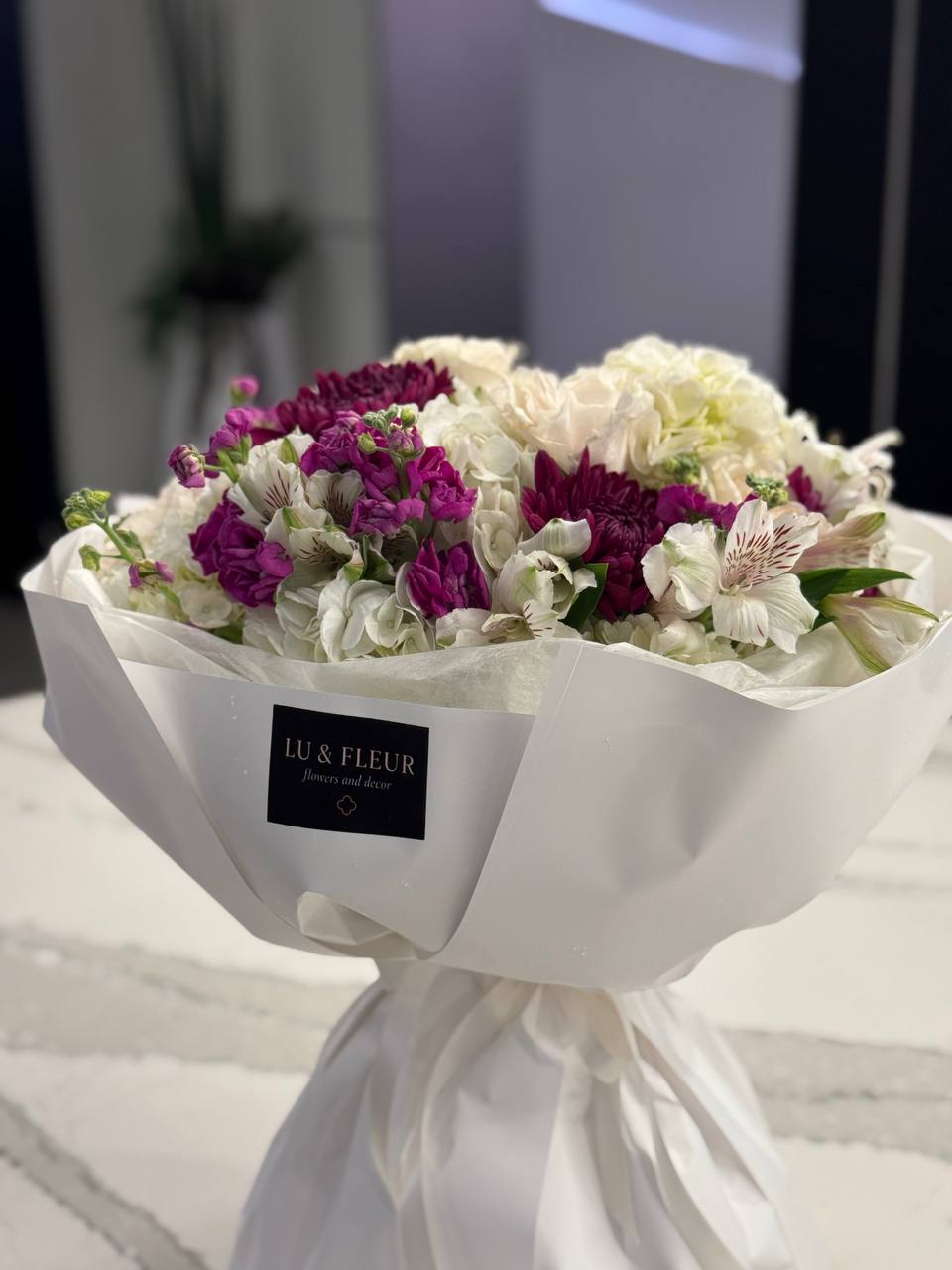 Elegant white and violet blooms wrapped in signature white paper. A timeless gift of serenity.