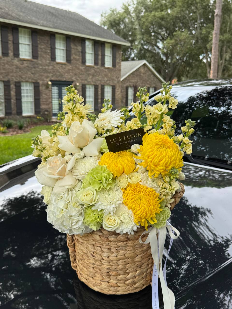 A radiant basket of white roses, yellow chrysanthemums, and green carnations. Fresh, festive, and refined.