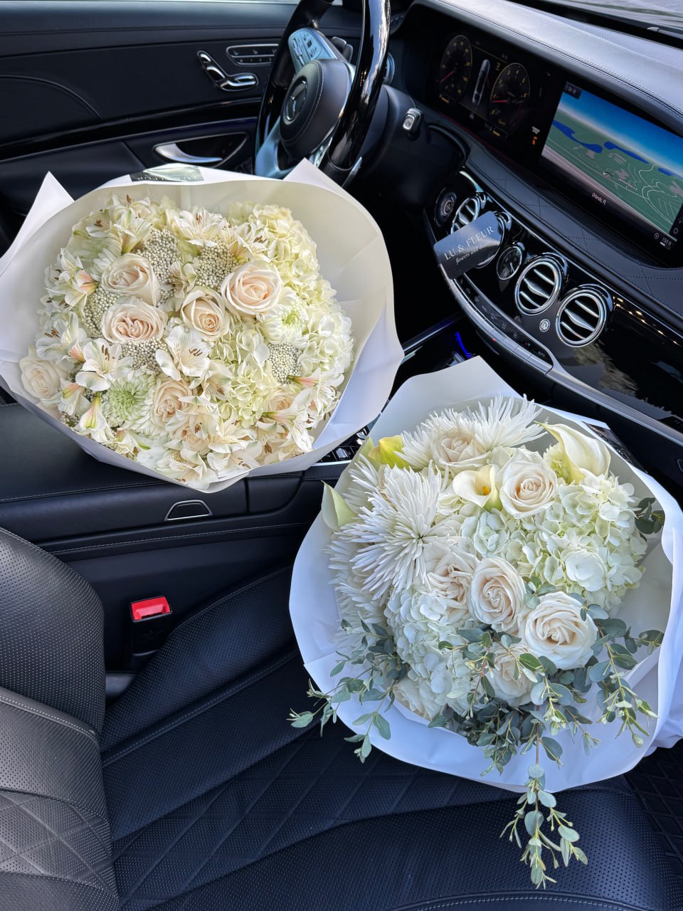 Two elegant bouquets in soft ivory tones, crafted for refined moments and luxurious delivery.