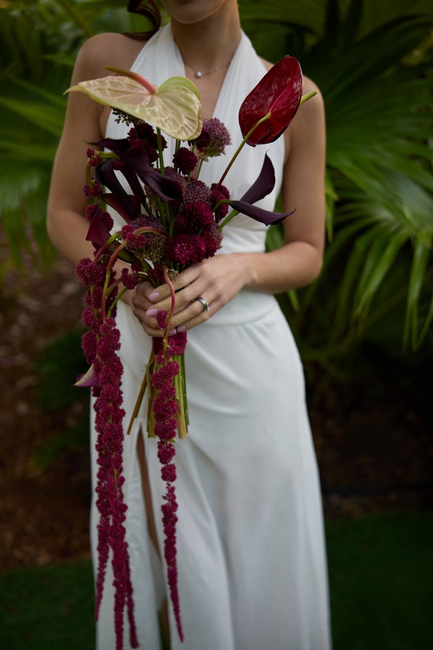 A dramatic, avant‑garde bouquet featuring burgundy anthuriums, dark calla lilies, cascading amaranthus, and deep plum scabiosa. A moody tropical composition with sculptural lines and rich, high‑fashion tones.