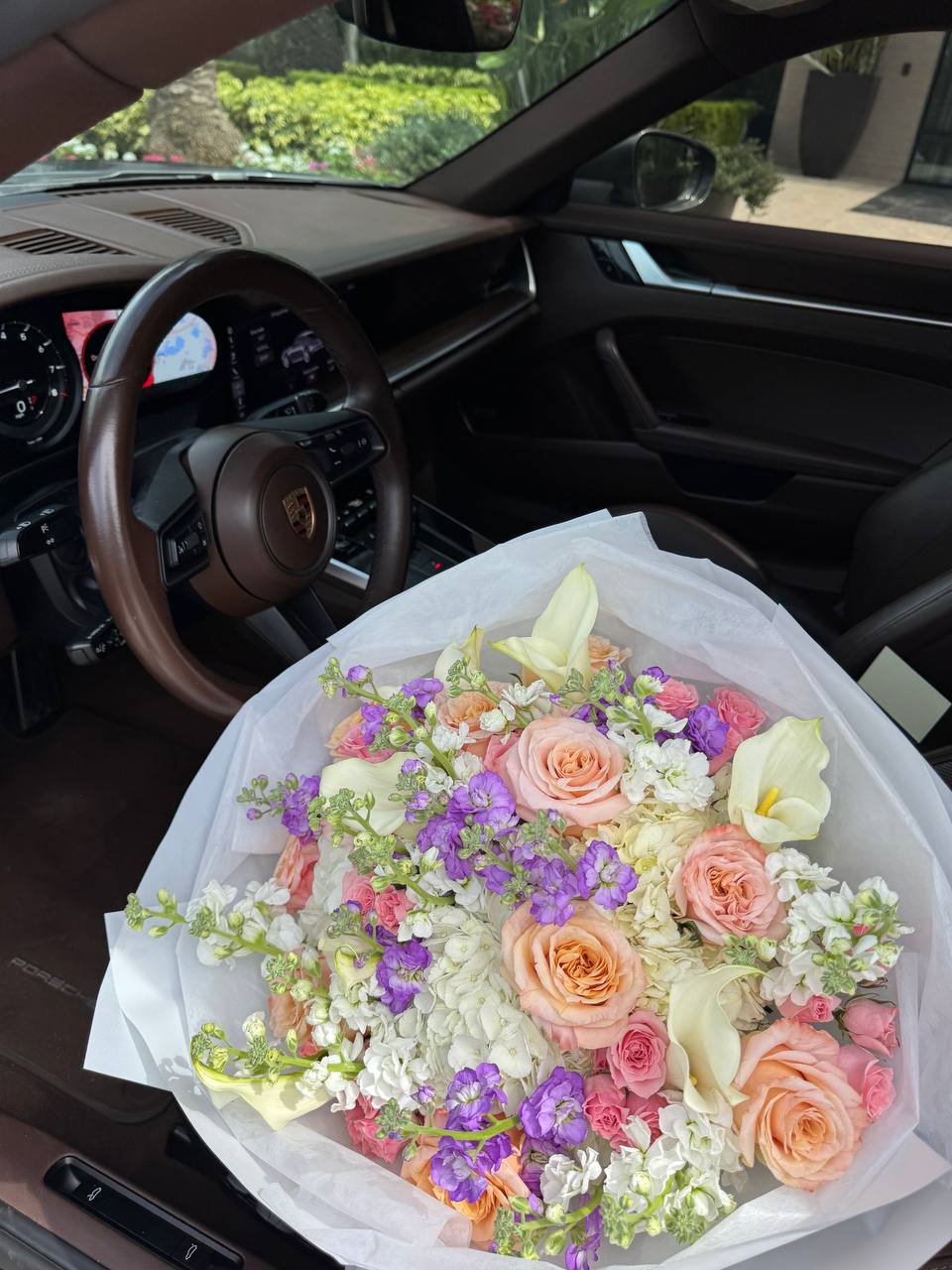 A luxurious bouquet of peach roses, white hydrangeas, calla lilies, and violet accents. Elegant and expressive.